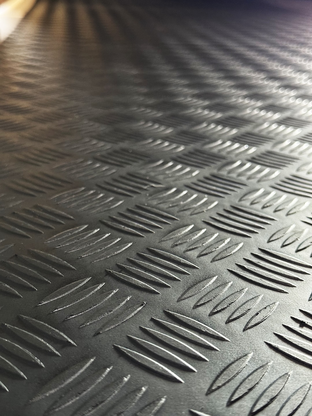 Slitstark gummimatta i svart durkmönster som ger ett robust, halkfritt och skyddande golv i din transportbil. Perfekt för hantverkare, servicebilar och alla som behöver en tålig matta som kan anpassas efter behov.