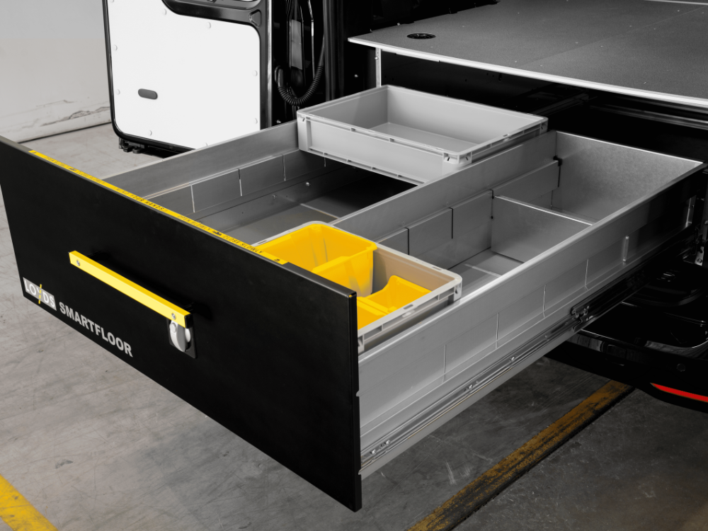 Med Smartfloor dubbelgolv till Volkswagen Caddy Cargo Maxi får du extra höga lådor som rymmer hela 0,75 m3 och har en nyttolast på upp till 500 kg. Du har alltid full översikt över alla verktyg och material som förvaras i bilinredningen med de stora lådorna. Robust inredning till Sveriges mest sålda skåpbil.