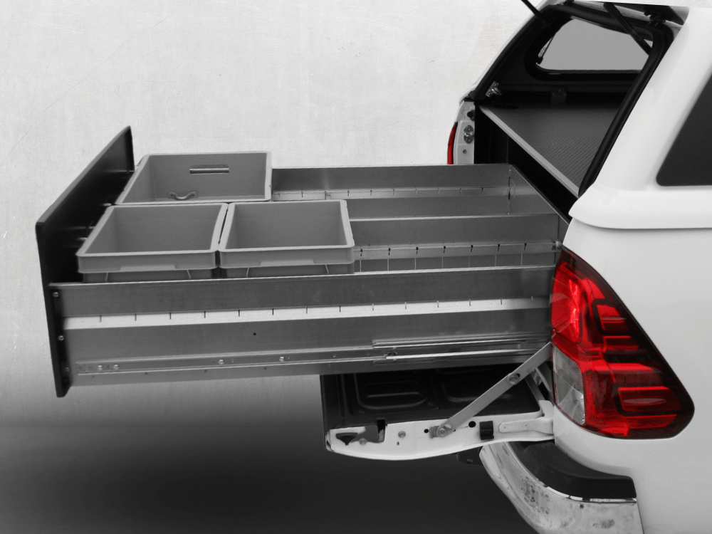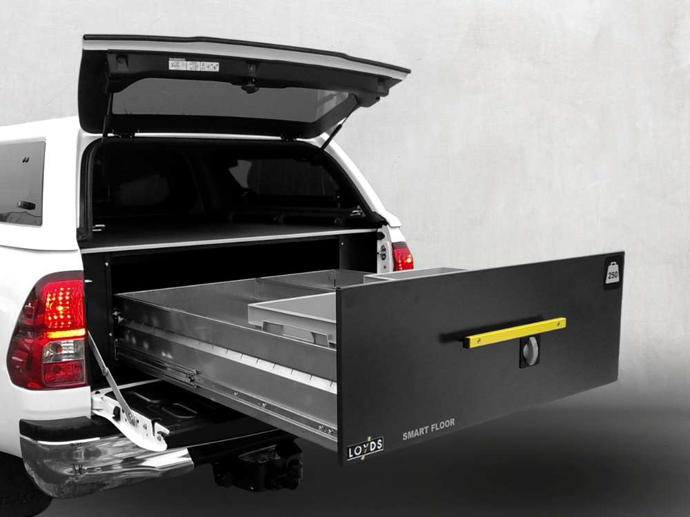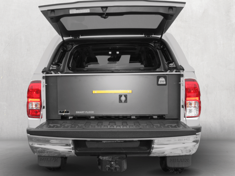 Med Smartfloor till Toyota Hilux D-cab får du en praktisk låda på ditt flak som har en nyttolast på 250 kg. Du har alltid full översikt över alla redskap och material som befinner seg i den stora lådan under kåpan. Det medföljer 3 st plåtavdelare samt 2 st plastbackar (1 stor och 1 medium).