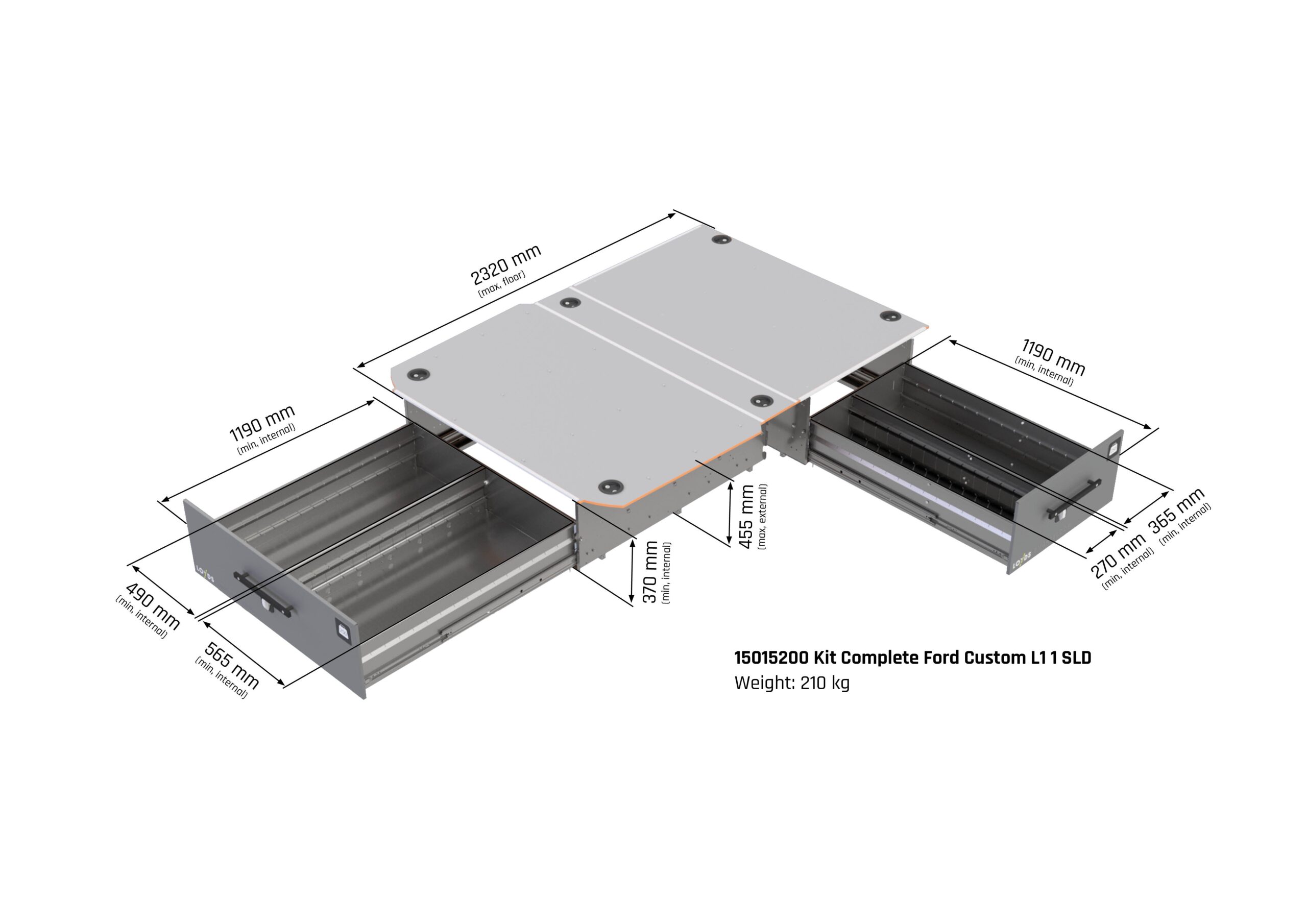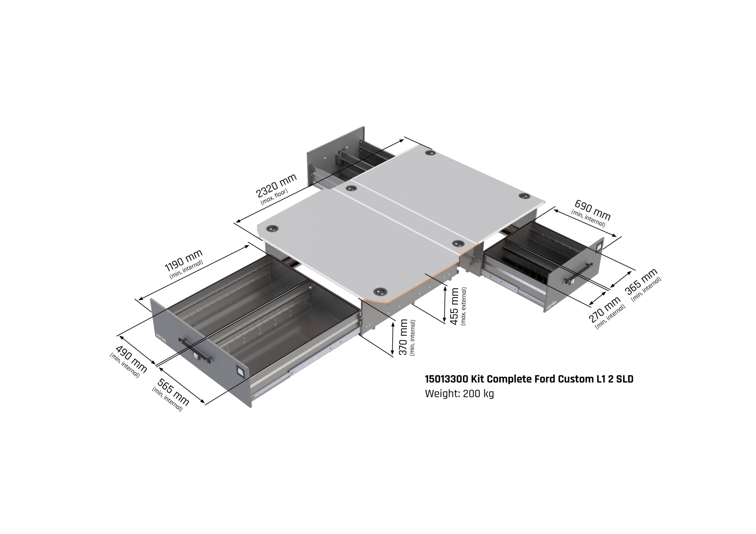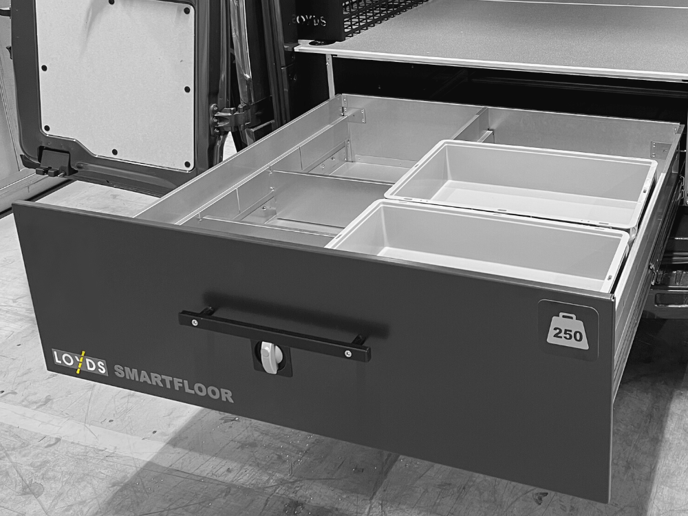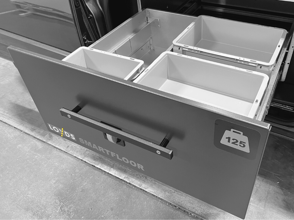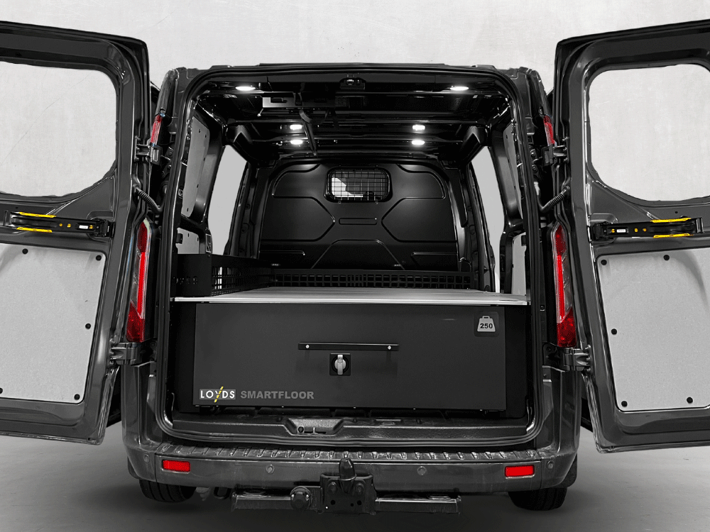 Med Smartfloor som bilinredning till Ford Transit Custom får du extra höga lådor som rymmer en lastvolym på hela 1m3 och har en nyttolast på 500 kg. Du har alltid full översikt i skåpbilen över alla verktyg och material som förvaras i de stora lådorna i dubbelgolvet. Med Smartfloor bilinredning i ditt lastutrymme i din Ford Transit Custom får du både styling och proffsig organisering.
