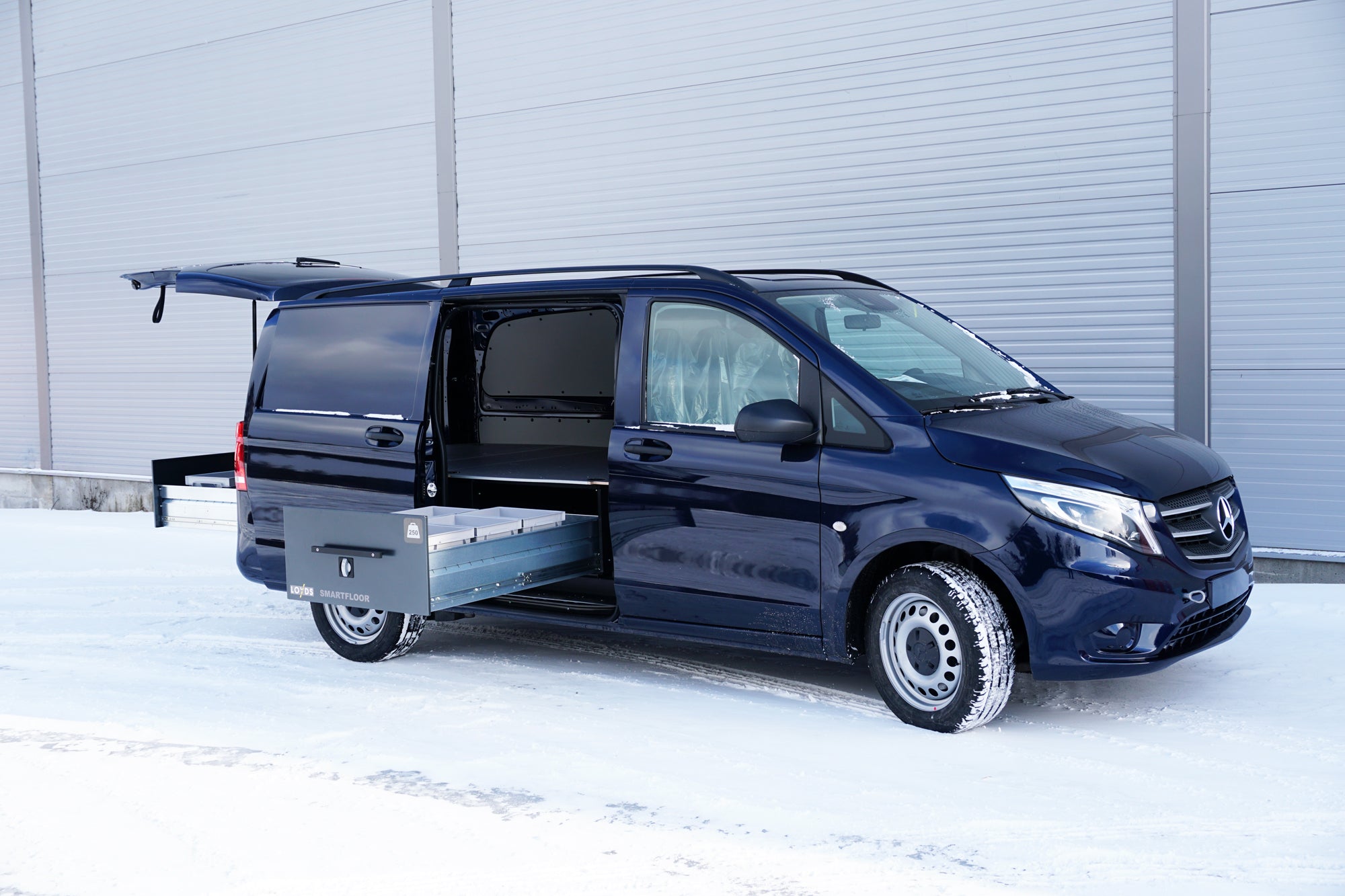 Med Smartfloor dubbelgolv frontmodul får du såväl styling till din Mercedes Vito som proffsig organisering i lastutrymmet. Detta tack vare extra höga sidolådor som rymmer hela 0,4 m3 och har en nyttolast på 250 kg. Du har alltid full översikt över alla av verktyg och material som förvaras i den stora lådan. Med denna bilinredningen till Mercedes Vito har du full takhöjd i bakre delen av lastutrymmet till skåpbilen till transport av extra höga varor och verktyg.